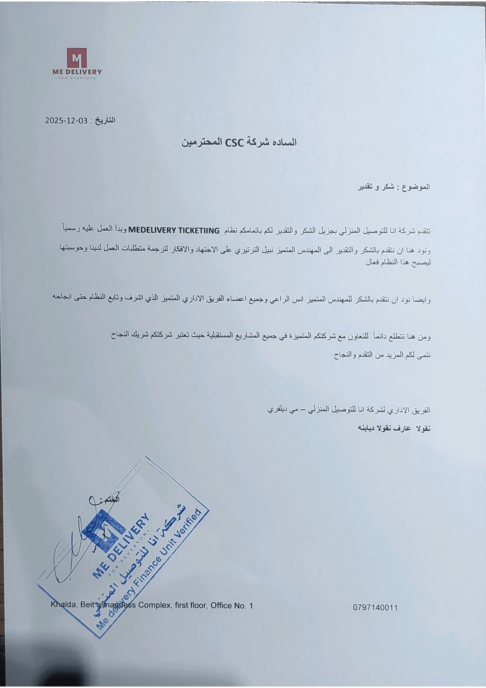 CSC Beyond is honored to receive a formal letter of appreciation from Me Delivery, recognizing the company’s commitment to delivering reliable and high-quality technology solutions.